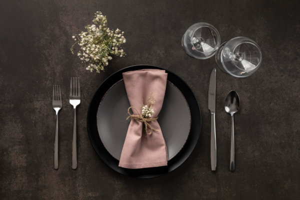 - الكؤوس: ضعي كأس الماء أعلى السكين مباشرةً. إذا كنتِ تقدمين مشروبات طبيعية أخرى، ضعي كؤوسها على يمين كأس الماء.