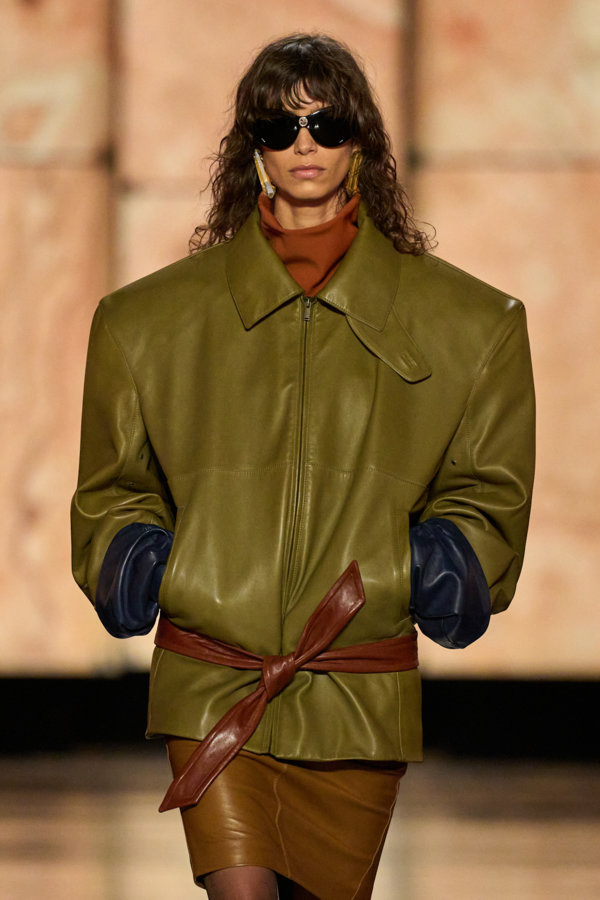بدورها قدّمت دار Saint Laurent جاكيت بقماش الجلد بهذا اللون، أتت بقصّة أوفرسايز وبأكتاف كبيرة. صيحة رائجة جداً هذا الخريف، اجتمعت بلون رائج أيضاً، قطعة مثاليّة في خزانتكِ.