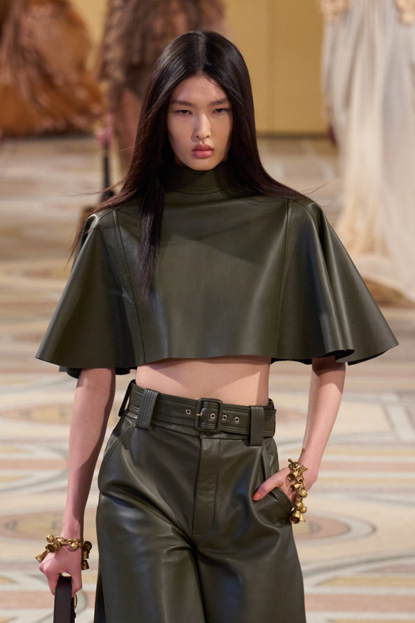 أطلّت عارضة أزياء دار Zimmermann بسروال من قماش الجلد بلون الكاكي مع كروب توب من القماش واللون نفسهما. Set مثالي لأيام الخريف الباردة، سهل التنسيق، مريح وعلى اخر موضة!