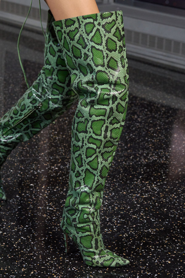تتقدّم الأحذية المزدانة بالنقوش البريّة أو الحيوانية واجهة الصيحات الشتوية، خصوصاً التصاميم الطويلة التي تصل إلى الركبة أو أعلى. تأتي بقصّة مستقيمة وغير ملاصقة للساق، ما يمنحها حضوراً لافتاً دون مبالغة. رغم جرأتها، يمكن تنسيقها بطريقة تخفّف من قوة النقش عبر اعتماد قطع بسيطة وهادئة مثل الفساتين الأحادية، التنانير الانسيابية أو المعاطف الطويلة.