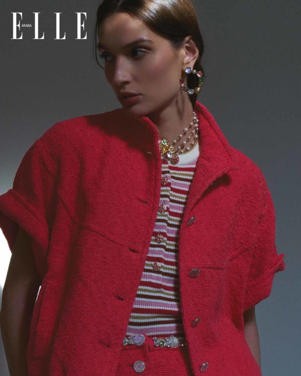سترة بلوزون من قماش التويد القطني الوردي الزاهي مزيّنة بأزرار مرصّعة بالجواهر؛ بلوزة من قماش قطني محبوك مخطّط باللونين البيج والأحمر، مزيّنة بأزرار مرصّعة بالجواهر؛ تنورة من قماش التويد القطني الوردي الزاهي مزيّنة بأزرار مرصّعة بالجواهر؛ قلادة من المعدن والزجاج والستراس؛ أقراط من المعدن والراتنج والزجاج والستراس؛ شبشب بكعبٍ عالٍ من الجلد الأسود اللامع. كلّه من Chanel Cruise
