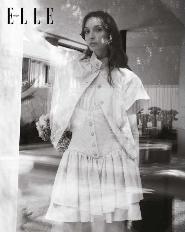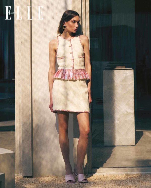 صدرية من التويد الفانتازي الأصفر الفاتح المزيّن بالترتر، مطرّزة بـ"ببلوم" مكشكش وضفيرة من الترتر بدرجات اللون الوردي، ومزيّنة بأزرار مرصّعة بالجواهر؛ تنورة قصيرة من التويد الفانتازي الأصفر الفاتح المزيّن بالترتر، مطرّزة بضفيرة من الترتر بدرجات اللون الوردي؛ أقراط من المعدن والزجاج؛ شبشب بكعبٍ عالٍ من الجلد اللامع الوردي الفاتح. كلّه من Chanel Cruise