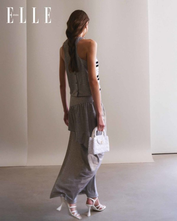 تيشيرت من قماش الجيرسيه المغطّى اللامع مطرّز بخطوط بيضاء، زرقاء، سوداء، وبيج، مزيّن بأزرار مرصّعة بالجواهر؛ تنورة غير متماثلة من قماش الجيرسيه المغطّى اللامع بخطوط بيضاء، سوداء وذهبية؛ حقيبة مزيّنة بالكامل بالترتر الأبيض؛ صندل بكعبٍ عالٍ من الجلد الأبيض اللامع. كلّه من Chanel Cruise