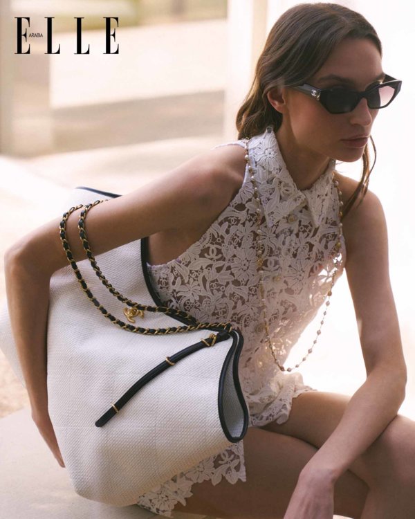 بلوزة من دانتيل الغيبور بلون البيج الفاتح، مزيّنة بأزرار مرصّعة بالجواهر؛ شورت من دانتيل الغيبور بلون البيج الفاتح، مزيّن بأزرار مرصّعة بالجواهر؛ نظّارات شمسية من الأسيتات الأسود والرمادي؛ قلادة من المعدن والزجاج والستراس؛ حقيبة منسوجة من الرافيا الأبيض، والجلد الأسود والمعدن. كلّه من Chanel Cruise