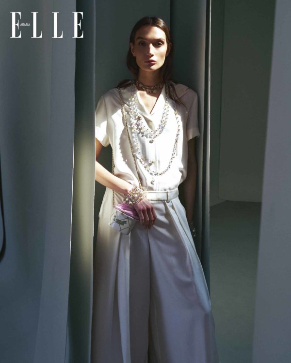 قميص من الحرير الخام العاجي بياقة بحّارة مزيّن بأزرار مرصّعة بالجواهر؛ بنطلون من الحرير الخام العاجي بكسرات؛ قلادات من المعدن والزجاج والستراس؛ أساور من المعدن والزجاج والستراس؛ حقيبة مينوديير من الزجاج الشبكي الأبيض والوردي الفاتح، والنحاس الذهبي، والستراس والمعدن. كلّه من Chanel Cruise