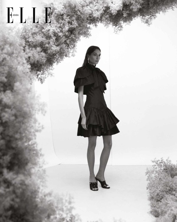 كاب قصير متطاير من قماش التفتا الجاكار الأسود مزيّن بعقدة عند الرقبة؛ فستان قصير متطاير من قماش التفتا الجاكار الأسود؛ شبشب بكعبٍ عالٍ من الستراس الأسود. كلّه من Chanel Cruise