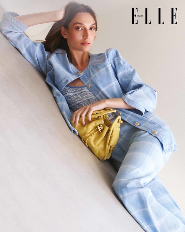 جاكيت من الدنيم الأزرق سماوي بخطوط بيضاء، مزيّنة بأزرار مرصّعة بالجواهر؛ -توب بلا أكمام محبوك معدني مخطّط باللونين الأزرق والأبيض؛ بنطلون من الدنيم الأزرق سماوي بخطوط بيضاء، مزيّن بأزرار مرصّعة بالجواهر؛ حقيبة يد Mini Chanel 25 من جلد الغزال الأصفر والمعدن. كلّه من Chanel Cruise