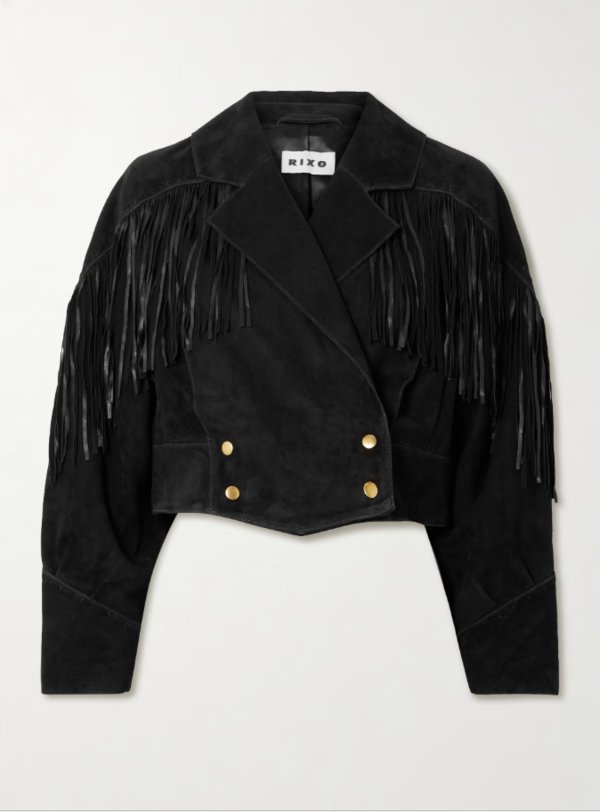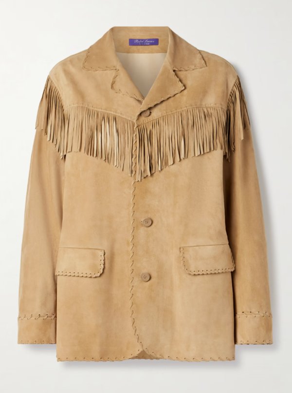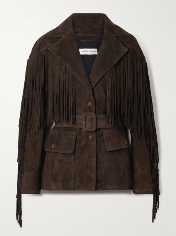 ما رأيكِ مثلاً بجاكيت مصمم من جلد سويد ناعم، بقصّة غير رسمية، مع أزرار وياقة كلاسيكية؟ الشرّابات عند الصدر والأكمام، تمنح الجاكيت حركة أنثوية ولمسة مميزة عند المشي.