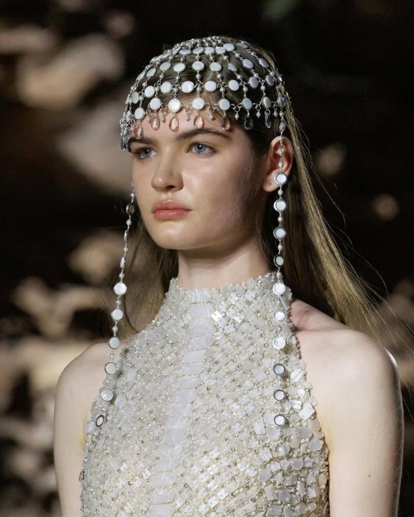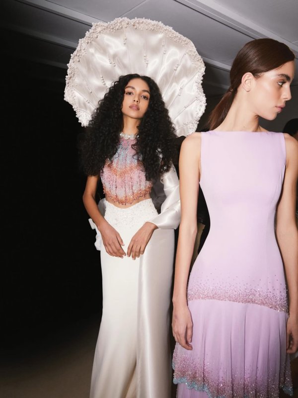 اللؤلؤ وُضع في قلب هذا الحوار بين الطبيعة والبناء؛ كل طبقة قُطعت وصقلت ودمجت بالحرارة مع القماش لتجمع بين صلابة الطبيعة وانسيابية الأزياء الراقية. كما استُخدمت أشكال اللؤلؤ المقصوصة بالليزر لتجسيد حركة الأمواج وإيقاعها الدقيق.
